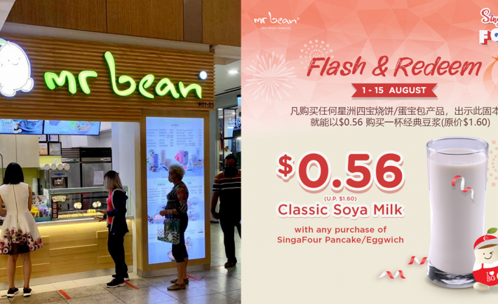 From now till 15 August 2021, simply flash the coupon below to redeem a Classic Soya Milk from Mr Bean for just $0.56, with purchase of any SingaFour Pancake/Eggwich!