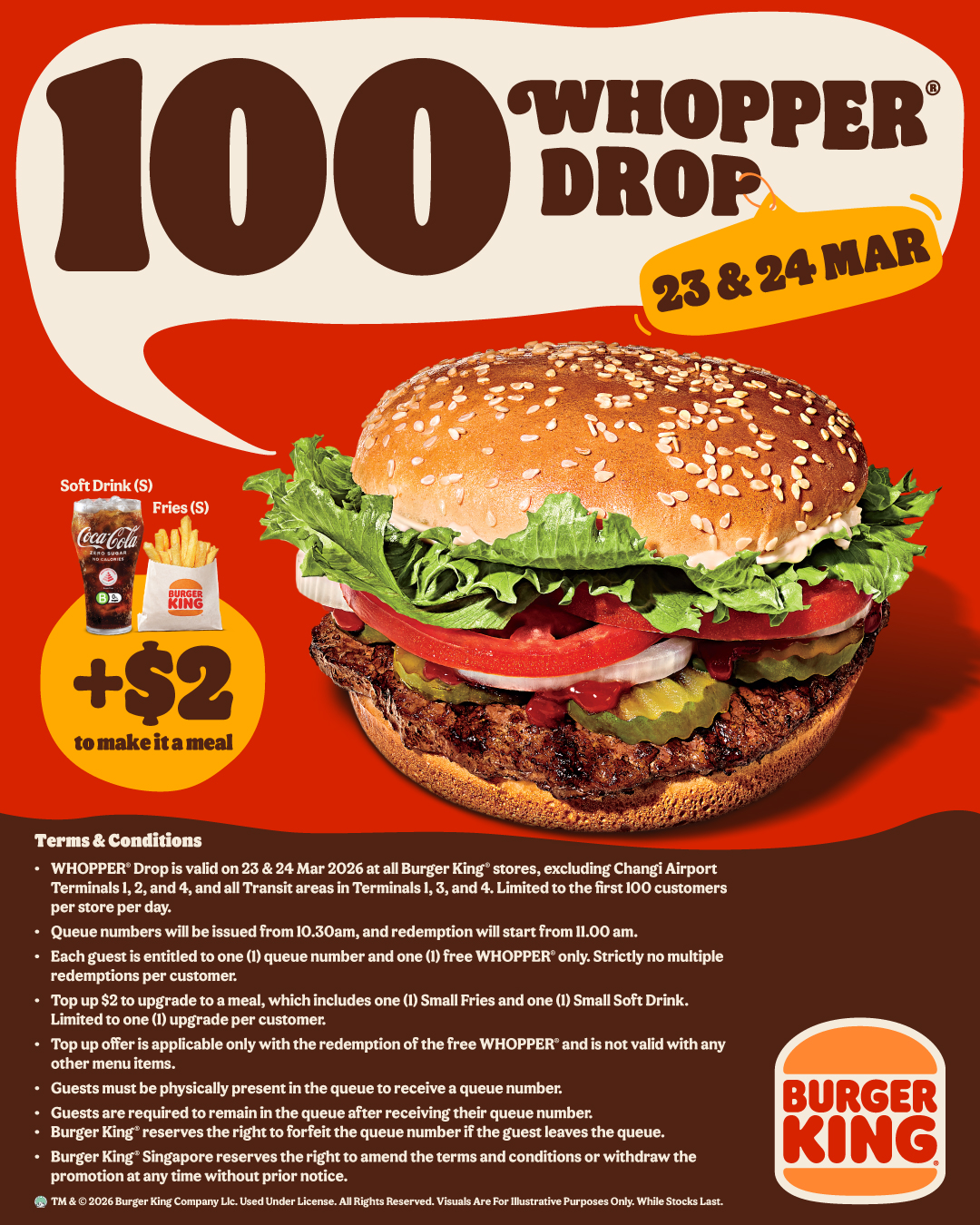 For 2 days only (23 & 24 March), Burger King Singapore is dropping 100 FREE WHOPPER® burgers per store, per day. No gimmicks, no minimum spend — just pure first-come-first-served action.