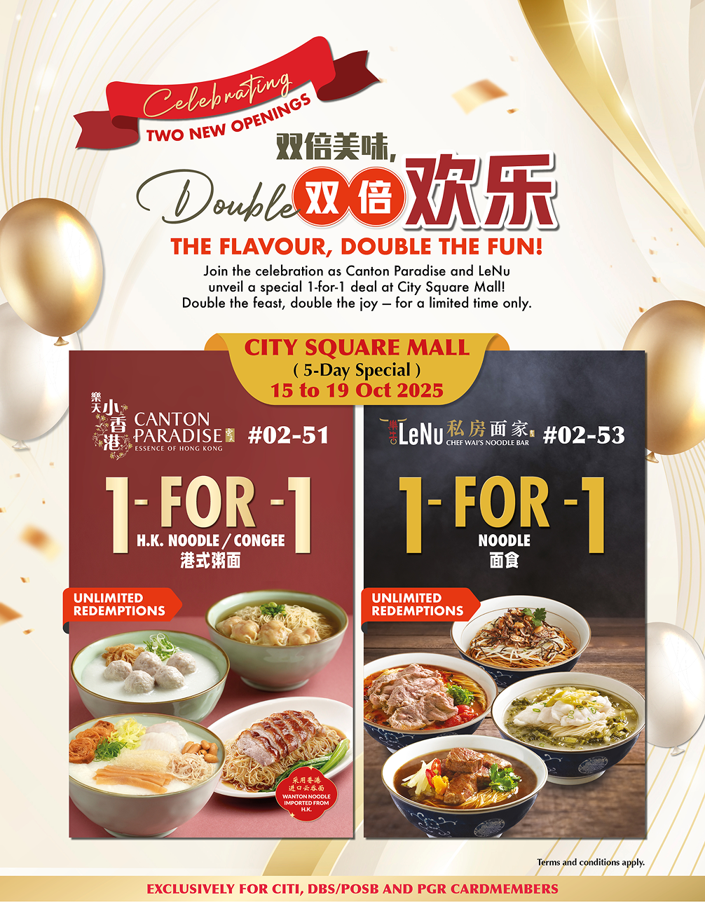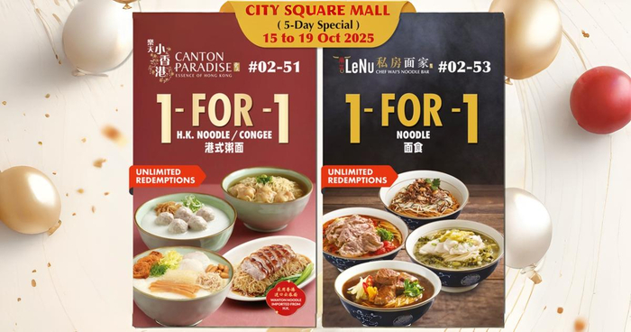To celebrate the grand openings of Canton Paradise (#02-51) and LeNu (#02-53), diners can enjoy an irresistible 1-for-1 deal on their signature noodles and congee — exclusively for Citi, DBS/POSB, and PGR cardmembers.