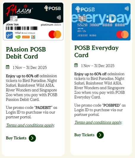 - Use <POSBPED> with your POSB Everyday Card, or <PADEBIT> with your PAssion POSB Debit Card for 50% off admission tickets to Rainforest Wild ASIA, Singapore Zoo, Bird’s Paradise, River Wonders and Night Safari.