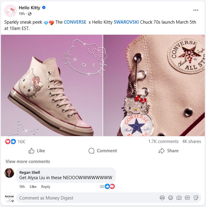 The Hello Kitty x Converse Collection will be released March 5, 2026 through Converse website and select retailers in-store and online, beginning with the US launch. The pair is priced at US$352, reflecting the premium materials and Swarovski crystal detailing.