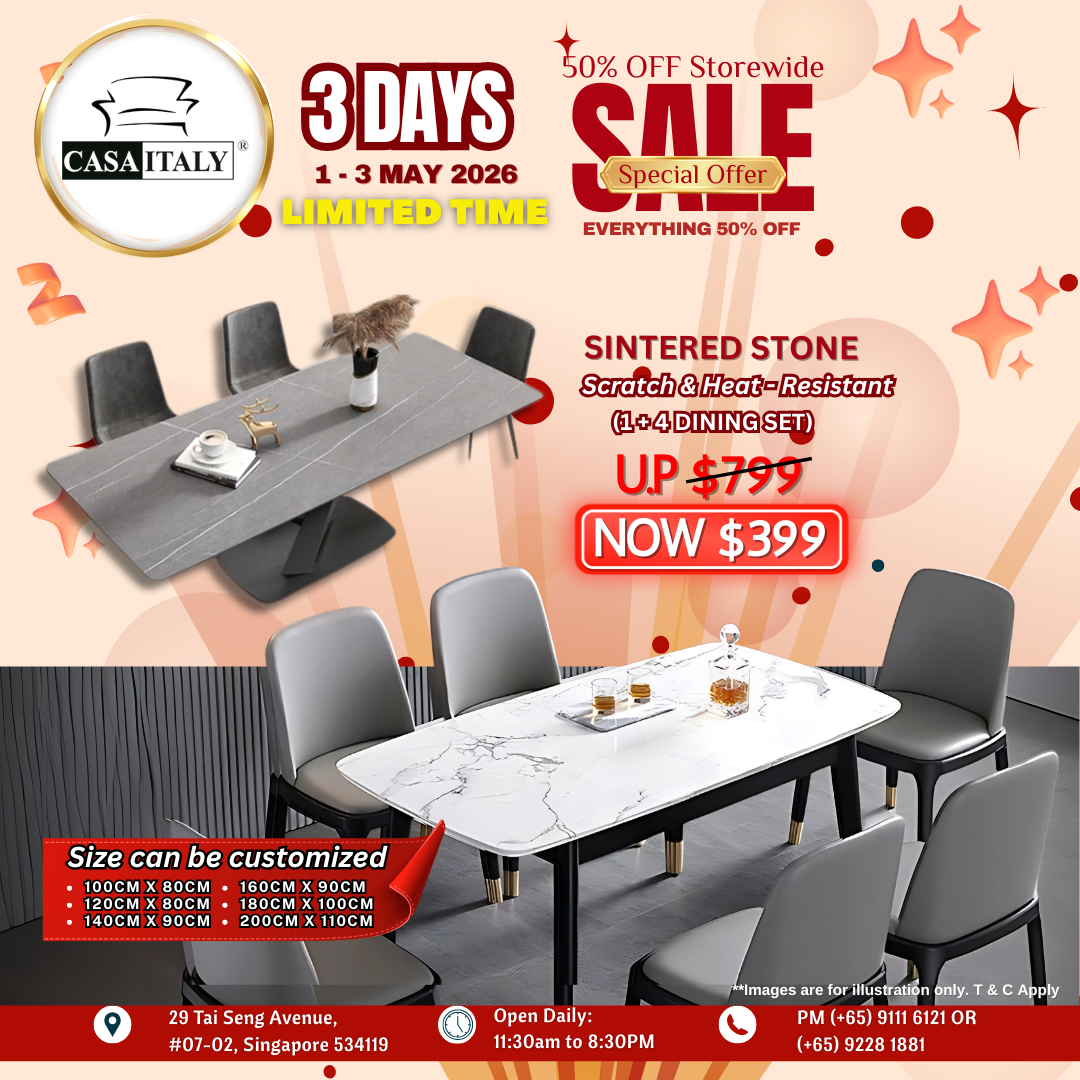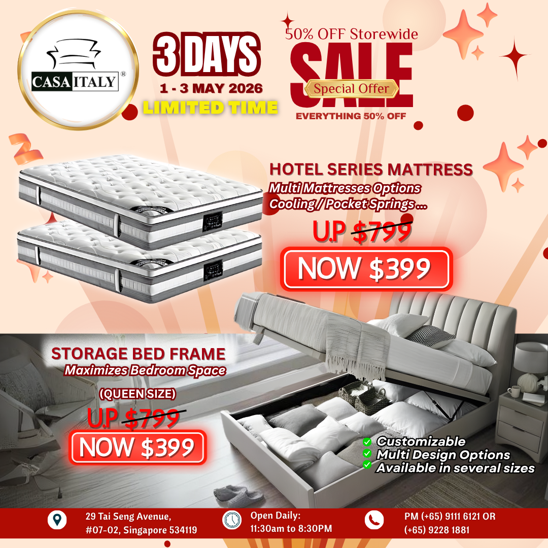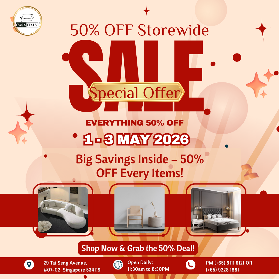 For a limited time only, enjoy 50% OFF storewide on sofas, dining tables, beds, mattresses, wardrobes and more. No need to pick or choose, everything is half price.Whether you’re upgrading your living room or refreshing your bedroom, this is your chance to bring home quality furniture at unbeatable value.