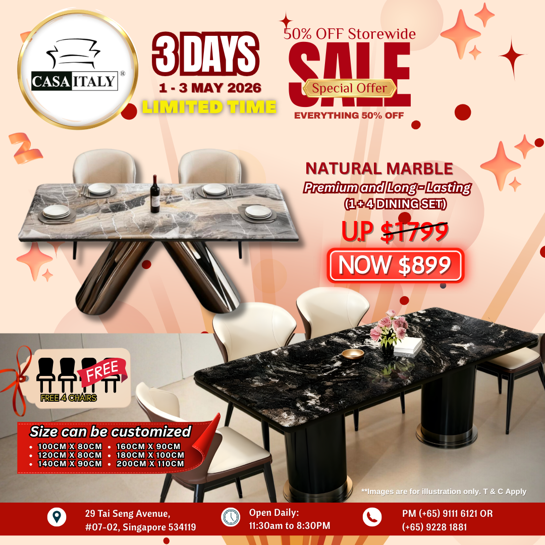 Selected natural marble tables start from $899. Featuring elegant stone textures and sturdy craftsmanship, these statement pieces elevate any dining area. Limited ready stock available.