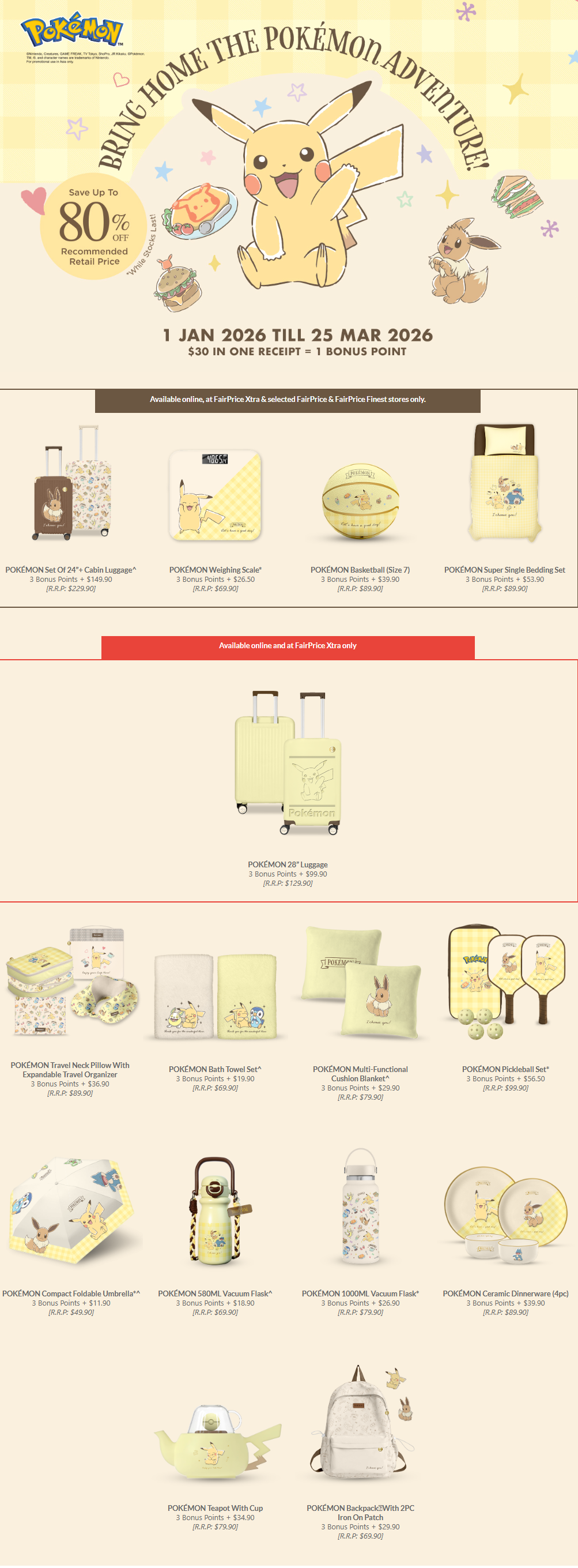 - Redemption of the Pokémon Set of 24” + Cabin Luggage, Pokémon Weighing Scale, Pokémon Basketball (Size 7) and Pokémon Super Single Bedding Set are available online, at FairPrice Xtra, selected FairPrice and Finest stores only.