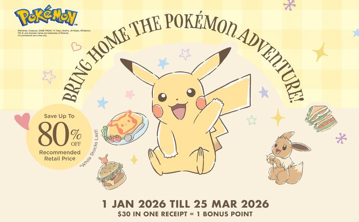 From 1 January to 25 March 2026, Pokémon fans can bring the adventure home with a massive lifestyle redemption campaign at FairPrice Xtra and selected FairPrice and FairPrice Finest stores. Expect practical, everyday home essentials reimagined in soft pastel Pokémon designs — and discounts of up to 80% off recommended retail prices.