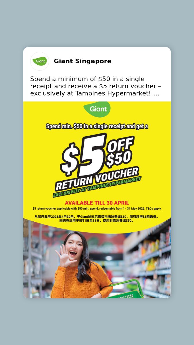 For a limited time, spend a minimum of $50 in a single receipt and you’ll receive a $5 return voucher, exclusively at Giant Tampines Hypermarket. It’s one of those no-frills, easy-to-understand deals that actually delivers value where it counts — right at checkout.