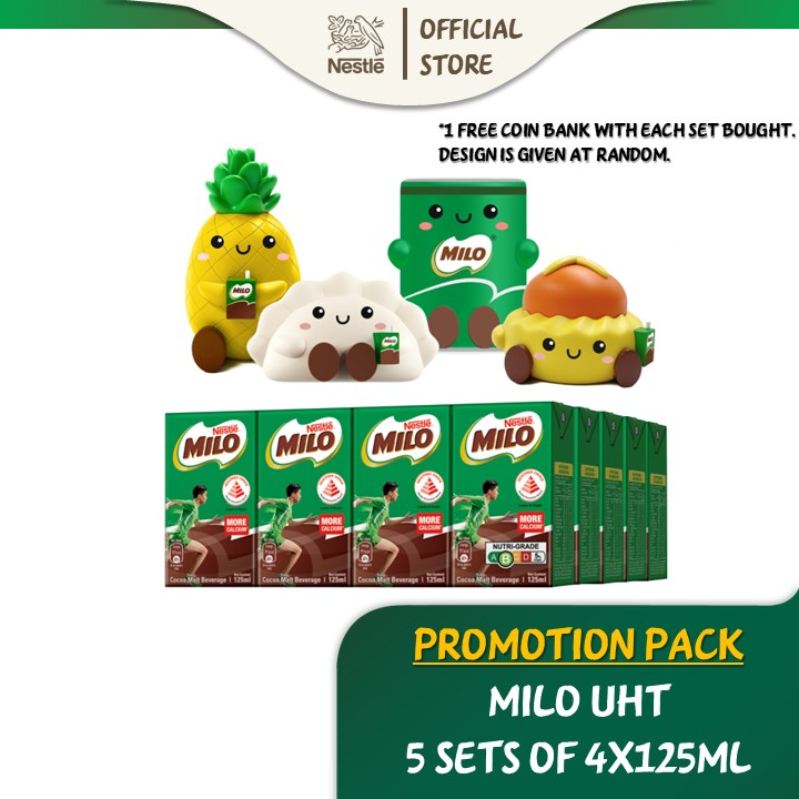 Purchase 5 clusters of MILO UHT Packets (4 x 125ml each) and get 1 FREE MILO Coin Bank.