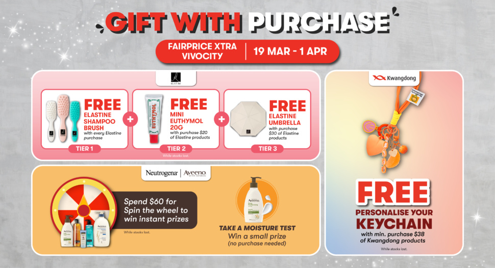 It’s the extras that make FairPrice Xtra VivoCity worth stopping by. The freebies start almost immediately — with Elasticine shampoo brushes, followed by a mini Euthymol toothpaste, and even a free umbrella as you move up the spend tiers. But what sets this outlet apart is the experience layered on top. Spend $60 and you get to spin the wheel for instant prizes, while brands like Aveeno and Neutrogena are running on-site moisture tests with small rewards, no purchase needed. There’s also a fun personalised touch with custom keychains available with minimum spend. With up to 28% OFF on top of all these perks, it feels less like a typical supermarket run — and more like an event you actually get something extra out of.