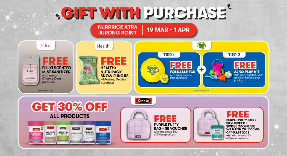 At FairPrice Xtra Jurong Point, the focus is clearly on wellness — and this is where the value really stacks if you’re planning a proper restock. You’re looking at up to 33% OFF, with Swisse going at 30% off storewide, but what makes it worth the trip is everything that comes on top. With purchase, you’ll pick up freebies like an Ellixi scented mist sanitizer or Health+ Snow Fungus packs, while Banana Boat purchases unlock tiered gifts such as a foldable fan or even a sand play kit. The real draw comes when you hit the higher spend tiers — where Swisse throws in a free puffy bag, vouchers, and even supplement bundles!