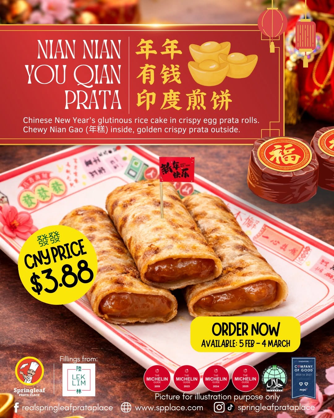 This festive prata is available from 5 February to 4 March, for a limited time only, and while stocks last. You can enjoy it dine-in or takeaway at all Springleaf Prata Place outlets islandwide. As always, the brand remains Halal-certified and Michelin Guide listed, which explains why their seasonal specials tend to move fast.