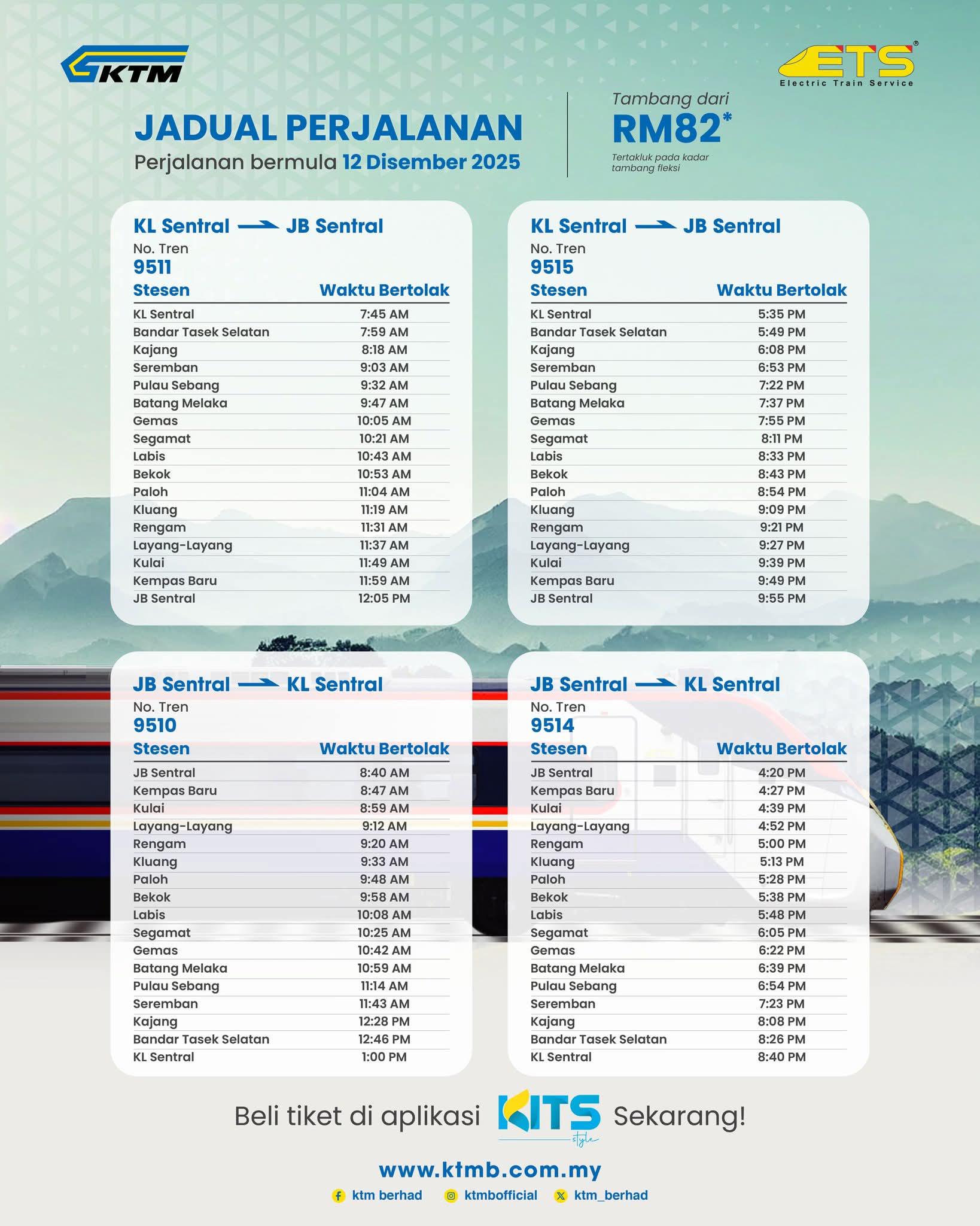ETS tickets from JB Sentral to KL Sentral start from RM82, with three service classes available: