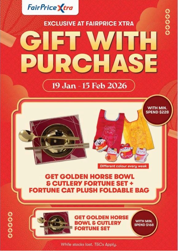 Take part in the festive up-spend campaign across all FairPrice Xtra stores and redeem these exclusive bags, available in four charming designs — perfect for families stocking up for CNY gatherings.