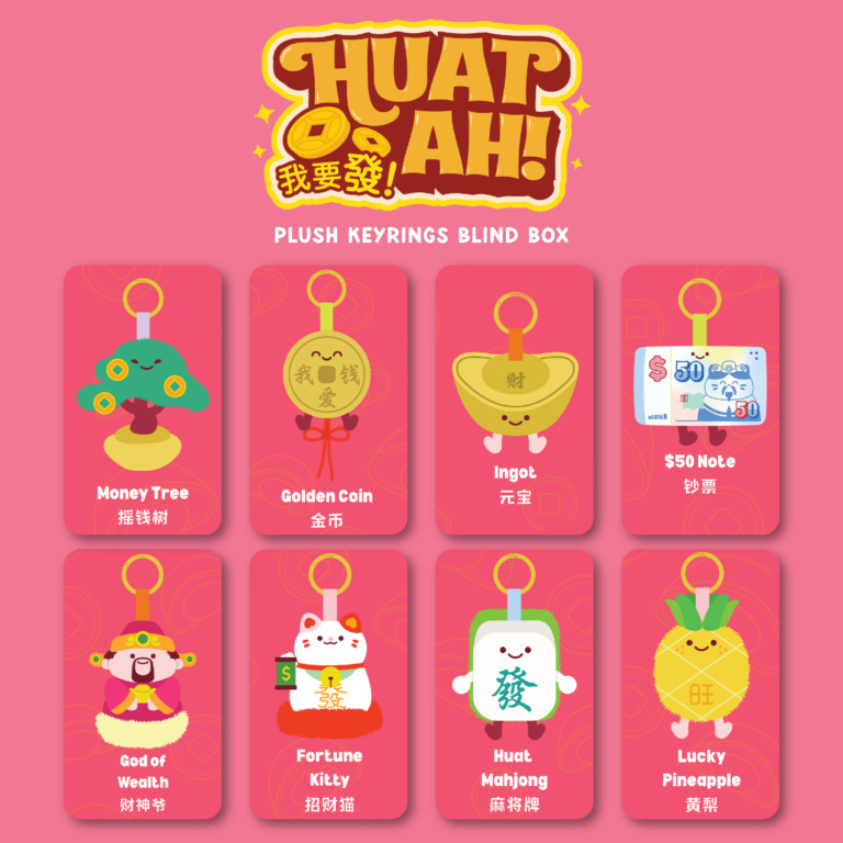 Eight “Huat Ah”-themed plush key rings packed with lucky motifs and festive energy — easy to clip on and carry throughout the new year.