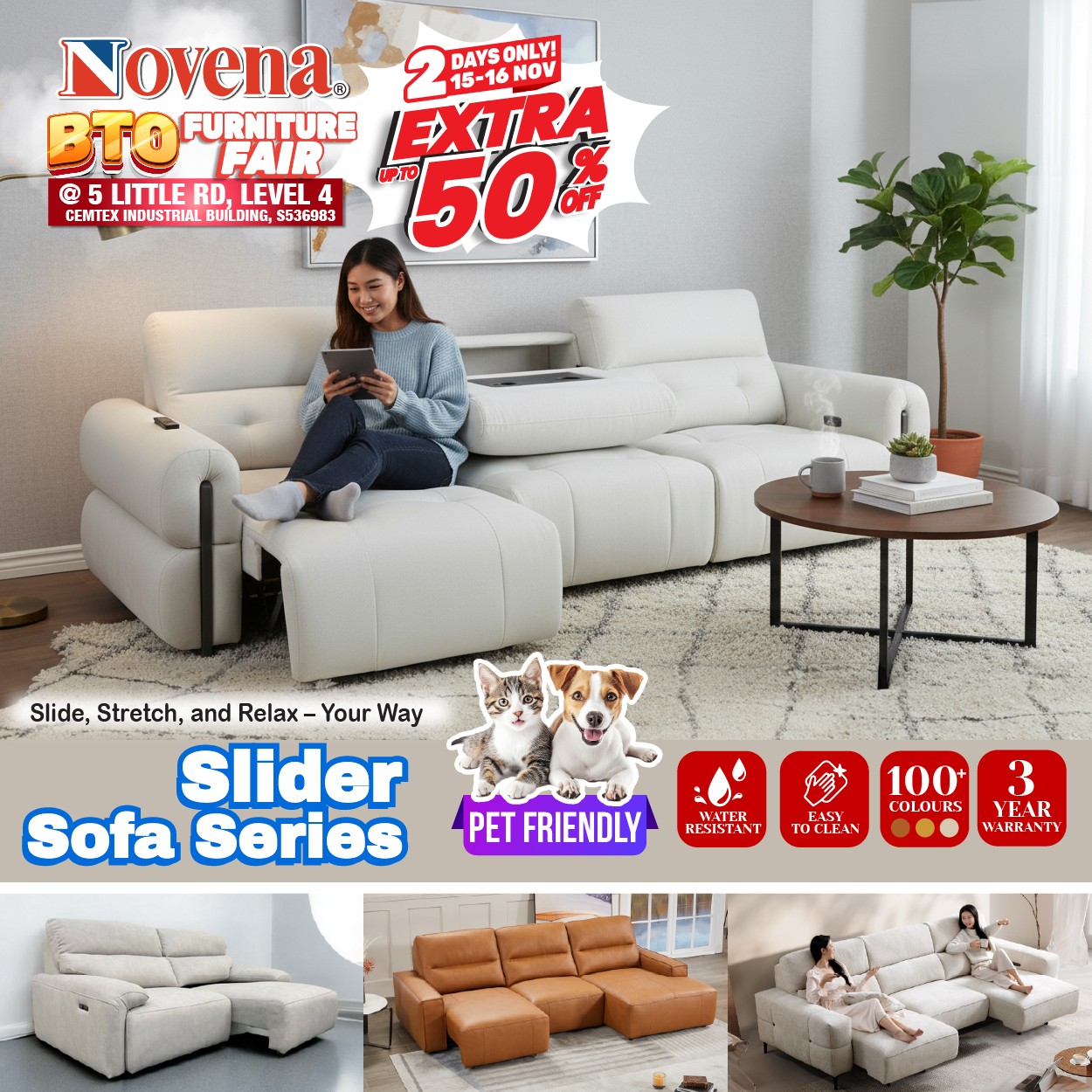Step into sofa heaven with Novena’s Slider Sofa Series, made for lounging in style. Stretch out after a long day — it’s pet-friendly, water-resistant, and comes in over 100 colours to suit every mood and room.