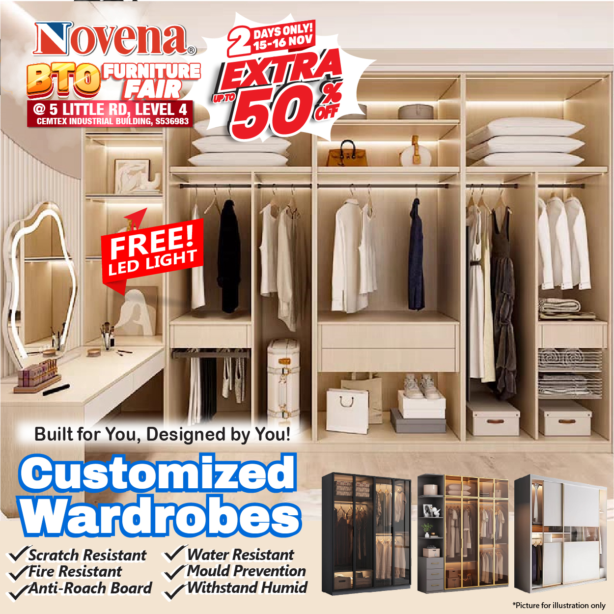 Keep your home organized with Customized Wardrobes, built for Singapore’s climate. Think scratch-resistant, fire-resistant, and anti-mould boards that can withstand humidity — plus a FREE LED light installation to brighten up your closet space.