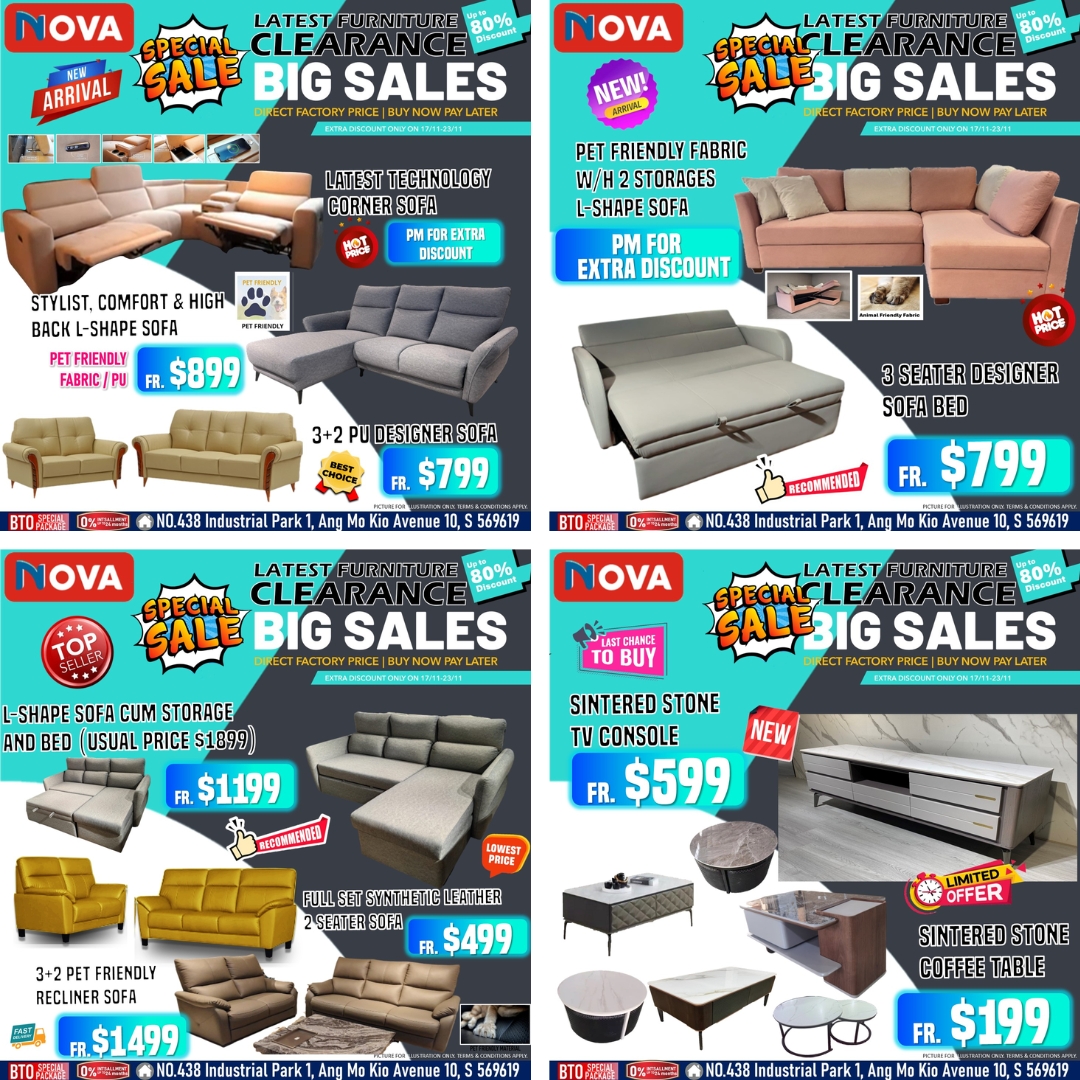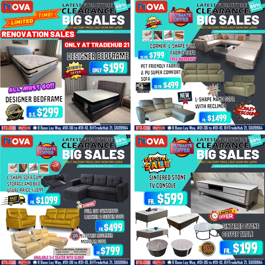 Singapore’s Largest Clearance Sofa Fair is happening now until 21st September at NOVA Tradehub 21 and Nova Ang Mo Kio outlets. Don’t miss your chance to score massive savings on premium furniture and transform your home in style.