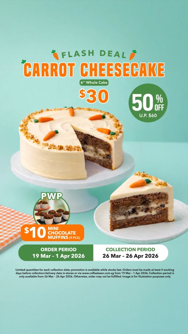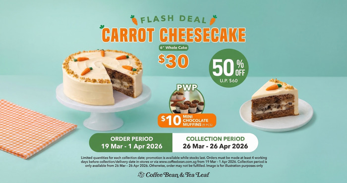 The Coffee Bean & Tea Leaf offering 50% off Easter Carrot Cheesecake at $30 (U.P. $60) from 19 Mar till 1 Apr 26