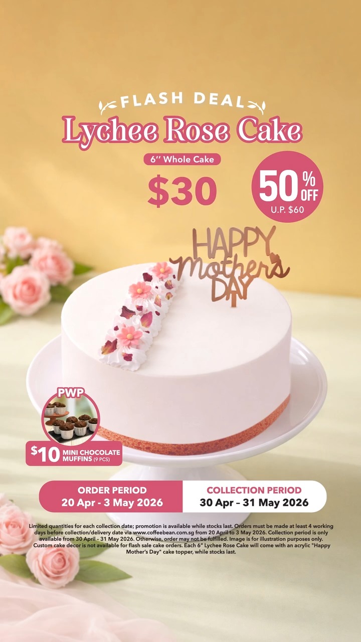 For a limited time, you can treat Mum to the elegant Lychee Rose Cake (6”) at 50% OFF — now just $30. Light, floral, and beautifully crafted, it’s the kind of cake that feels thoughtful without trying too hard.